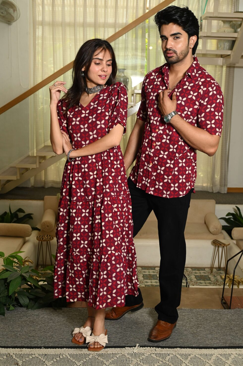 Couple Matching Maroon Cotton Anarkali Midi Dress and Shirt Set ? White Floral Print